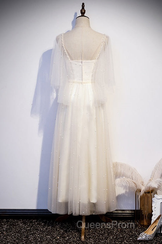 Light Champagne Short Sleeves Long Wedding Party Dress, Cute Evening Prom Dress