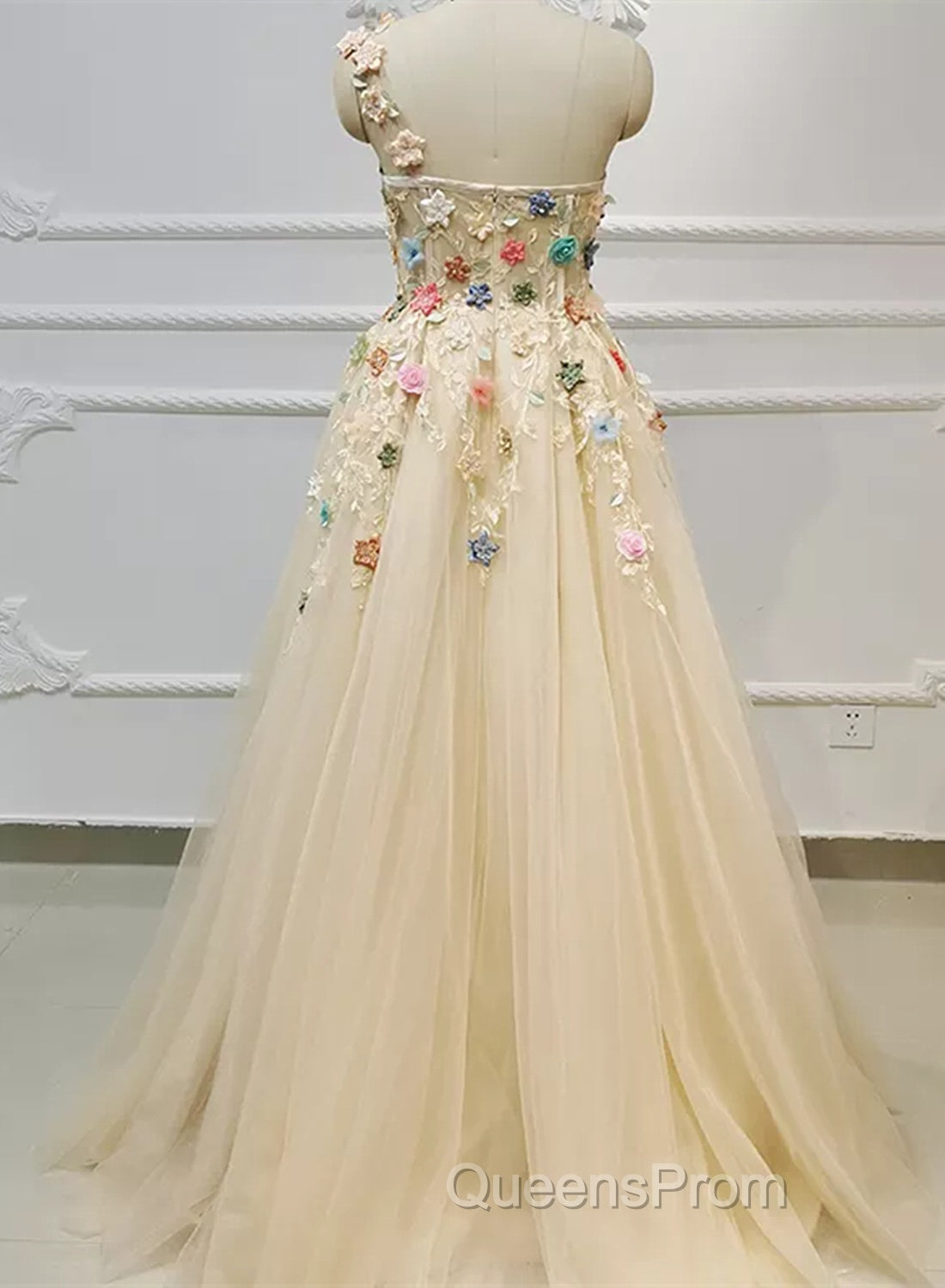 Light Champagne Tulle With Flowers Long Evening Dress, A-Line Tulle Formal Dress
