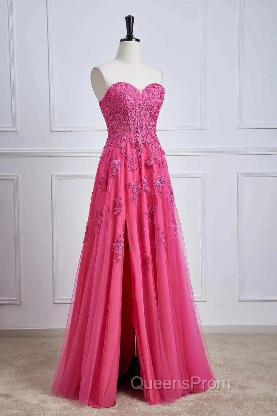 Long Fuchsia Evening Prom Dress Strapless A-Line Floral Formal Wear Slit