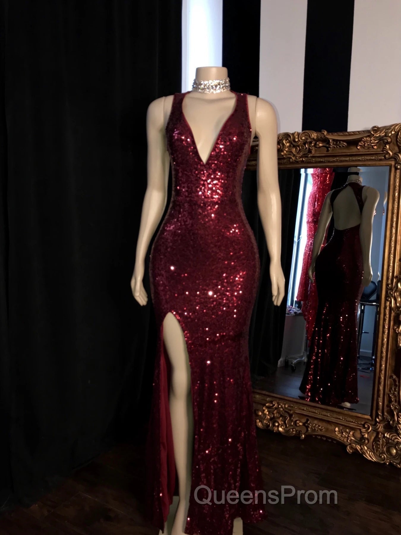 Long Mermaid Burgundy Sequin Evening Prom Dress Glitter Split Evening Gown