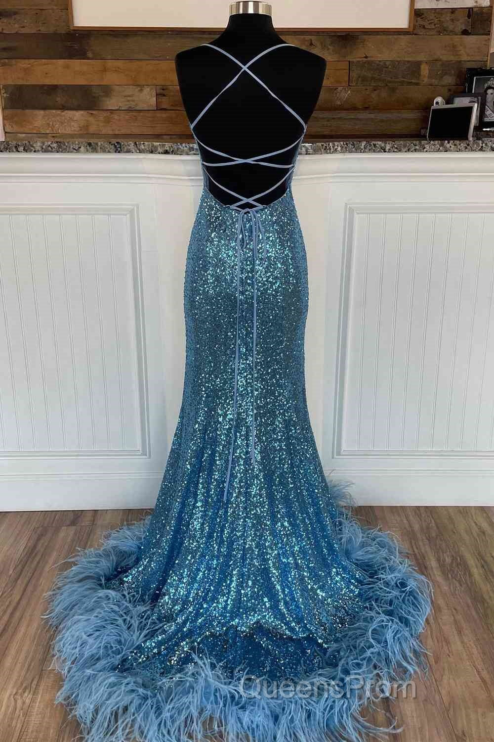 Long Sequined Blue Straps Evening Prom Dress with Feather Hem