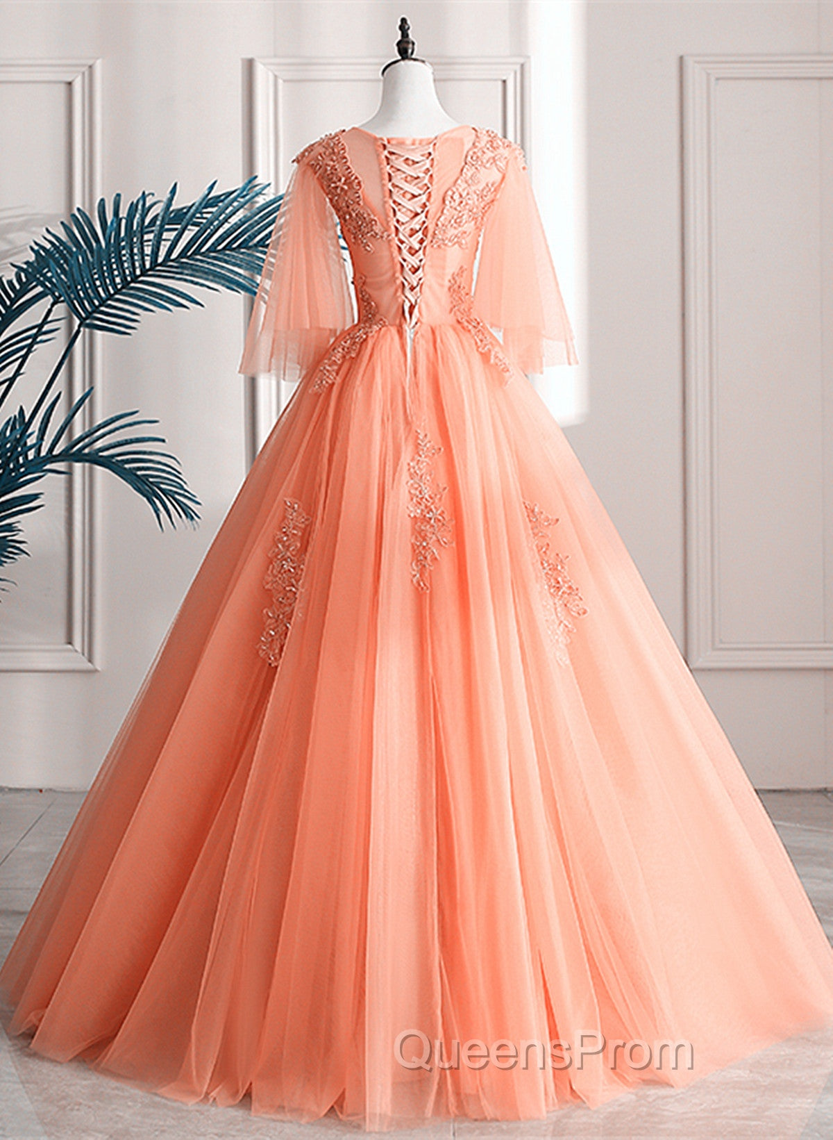 Lovey Tulle V-Neckline Long Party Dress With Lace, A-Line Tulle Sweet 16 Dress