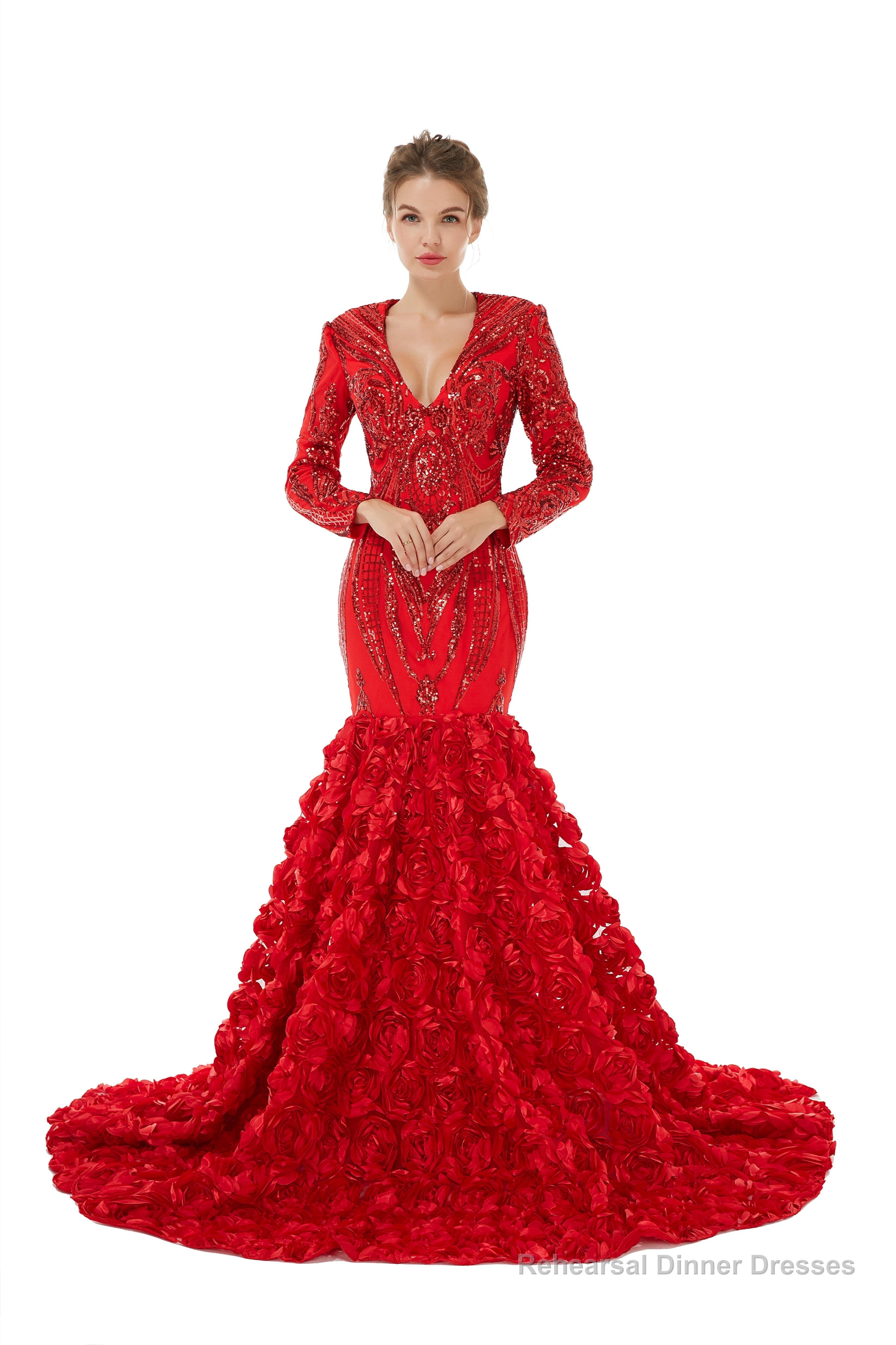 Mermaid Long Sequined Bling Full Sleeves Floral Skirt Prom Dresses