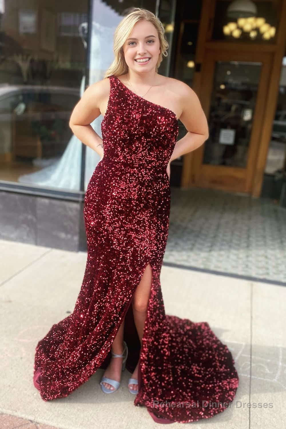 Mermaid One Shoulder Fuchsia Sequins Prom Dress with Slit