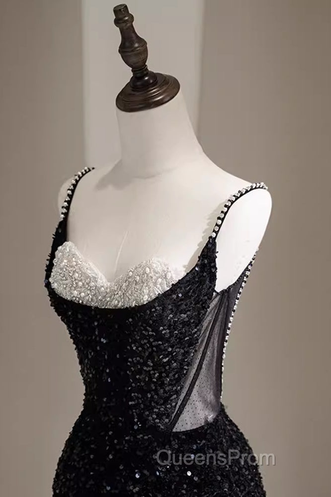 Mermaid Straps Long Black Sequin Evening Prom Dress