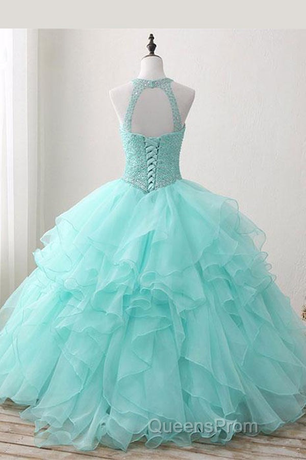 Mint Ball Gown Floor Length Halter Keyhole Back Beading Ruffles Evening Prom Dress