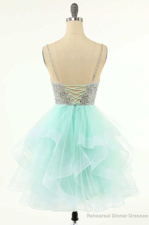 Mint Green Homecoming Dresses Straps V-Neck Multi-Layer Beaded Prom Dresses