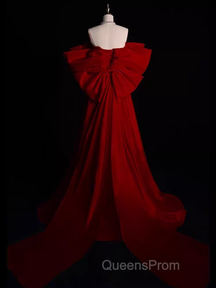 Modest A Line Strapless Long Short Sleeves Satin Red Evening Prom Dress
