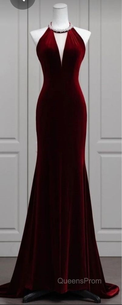 Modest Mermaid Scoop Neckline Burgundy Velvet Long Party Dress Evening Prom Dress