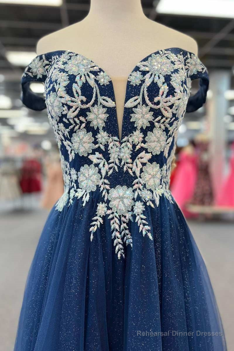 Navy Blue Floral Applique Lace-Up A-Line Long Prom Dress