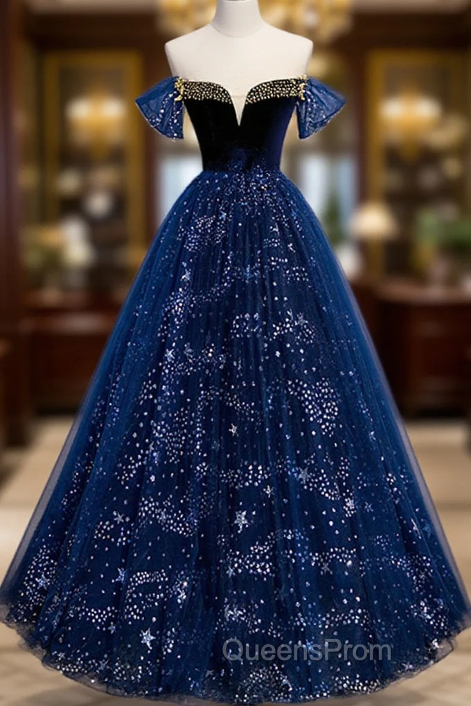 Navy Blue Tulle Off Shoulder Beaded Long Party Dress, Navy Blue Tulle Evening Prom Dress