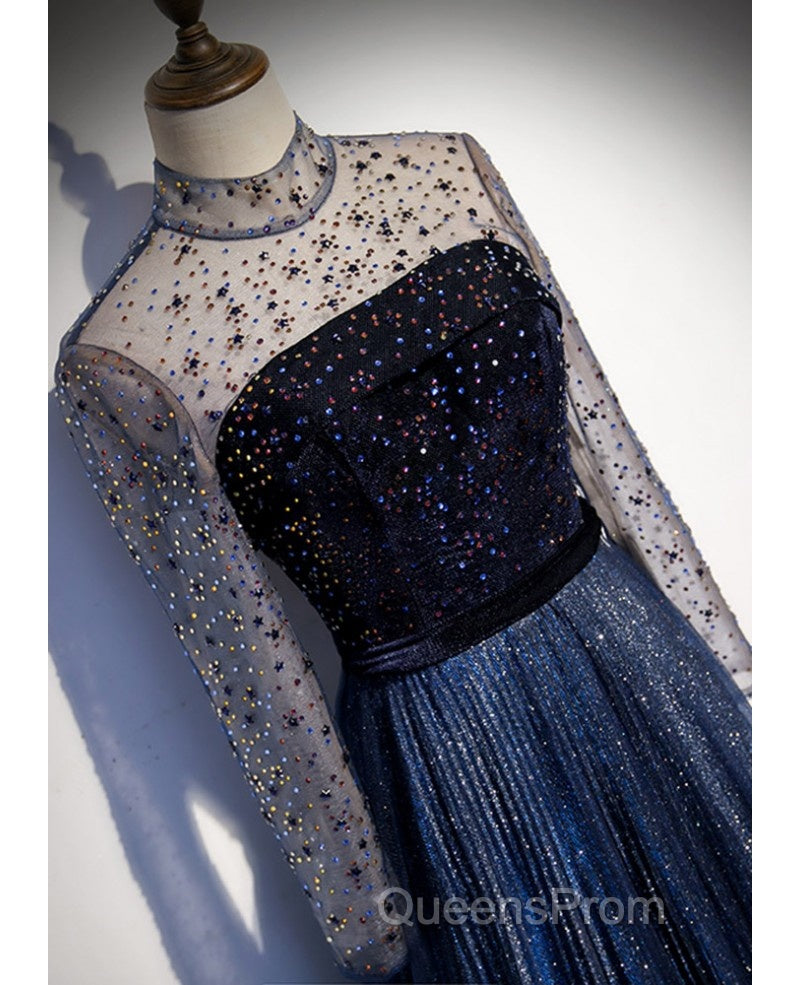 Noble Navy Blue Perspective High Neck Long Sleeved Water Diamond Sequin Ball Dress Navy Blue A-Line Princess Sparkling Backless Tulle Sweeping Tail Ruffle Edge Evening Dress