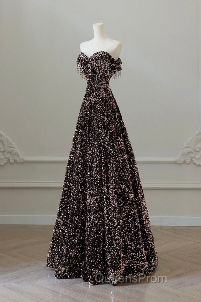 Off Shoulder A-Line Coffee Gold Sequin Long Evening Prom Dress, Coffee Gold Evening Dress