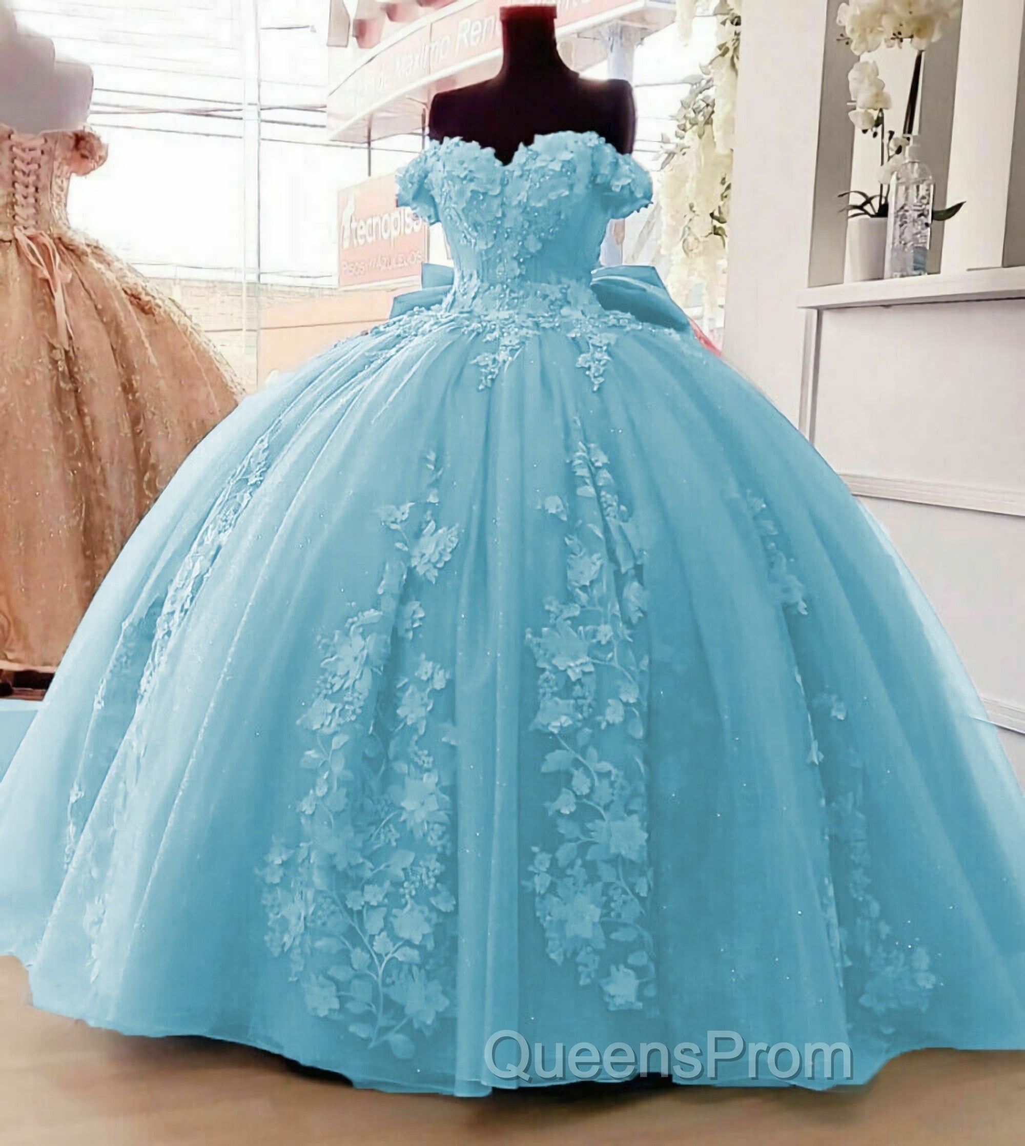 Off Shoulder Ball Gown Quinceanera Dress 3D Floral Applique Sweet 16 Gowns