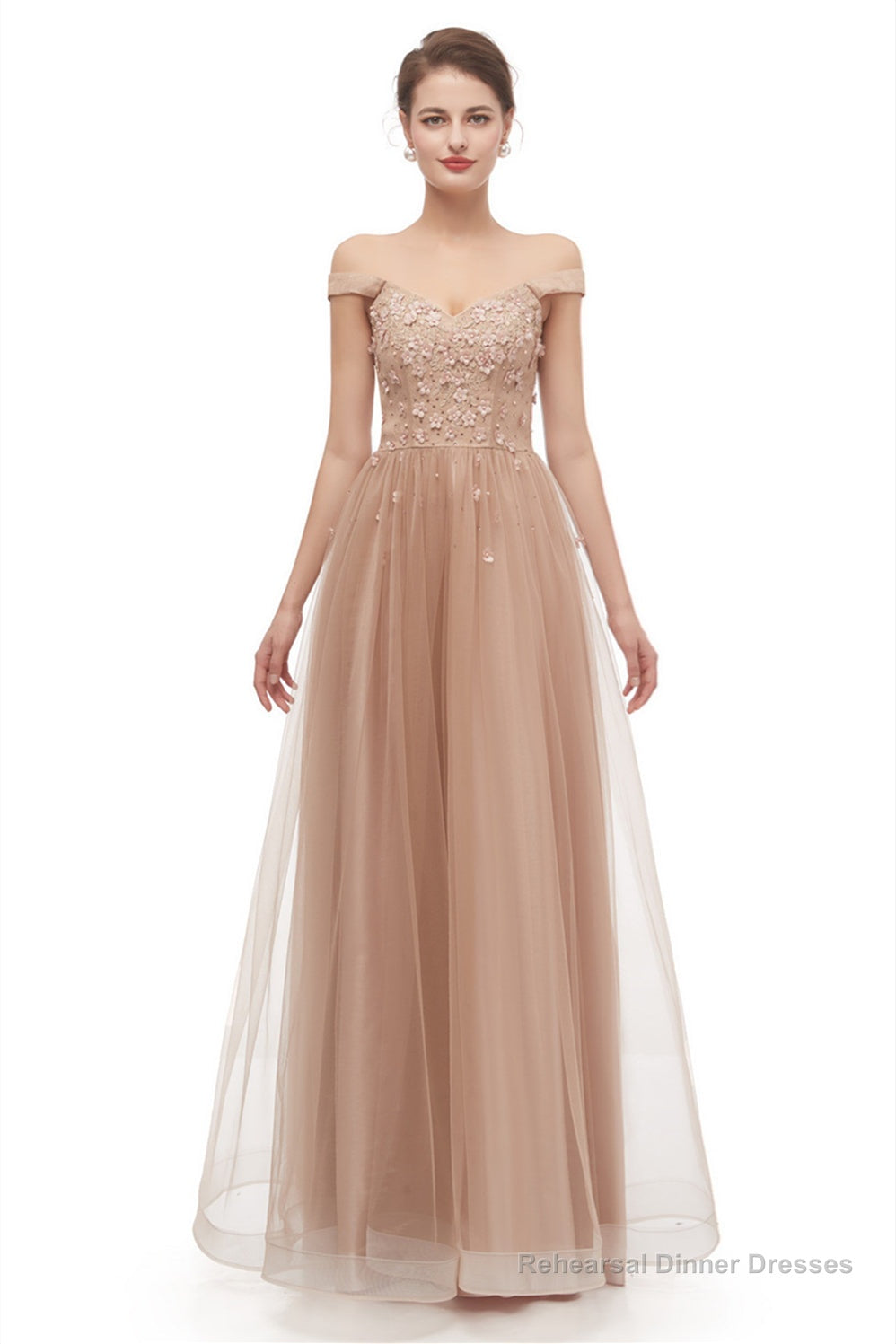 Off-Shoulder Pearls Applique A-Line Tulle Prom Dresses