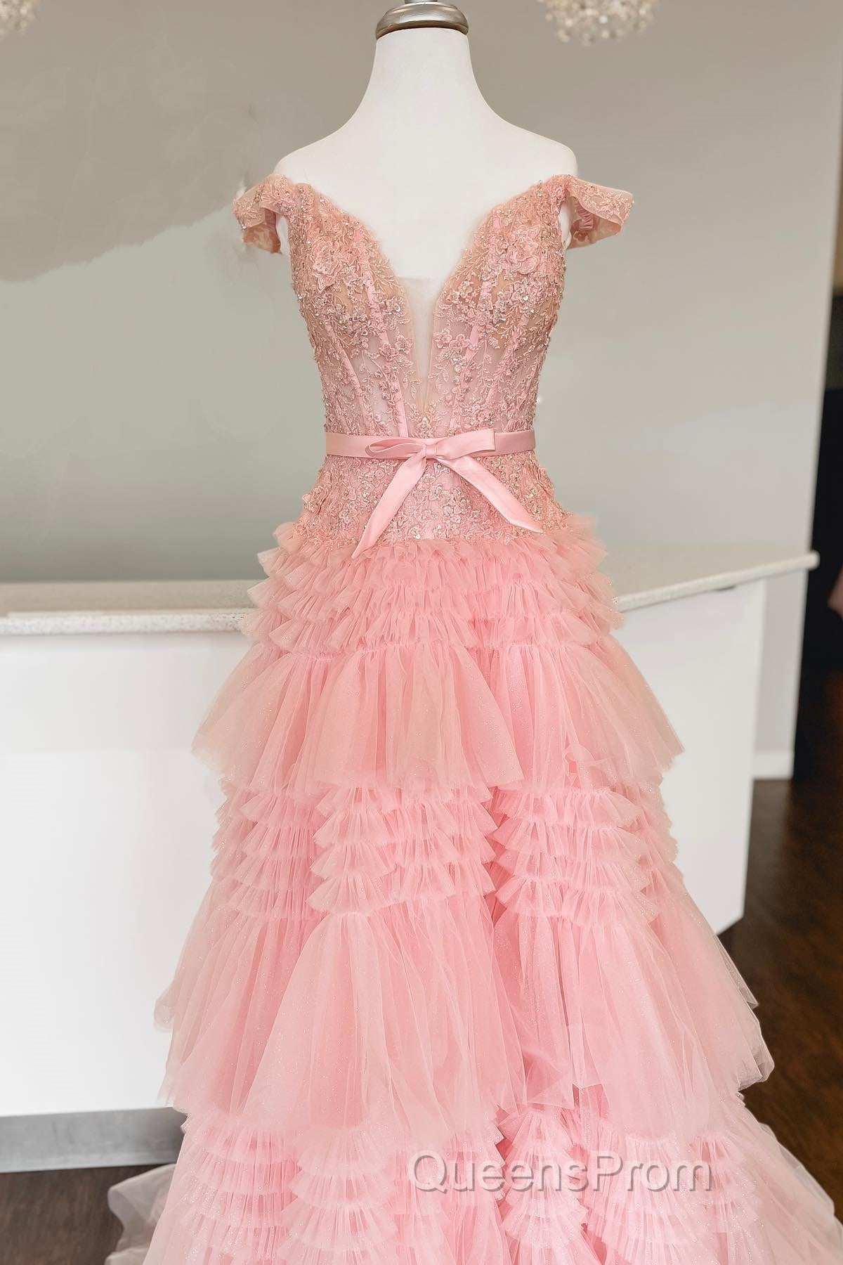 Off the Shoulder Red Appliques Tiered Long Formal Dress