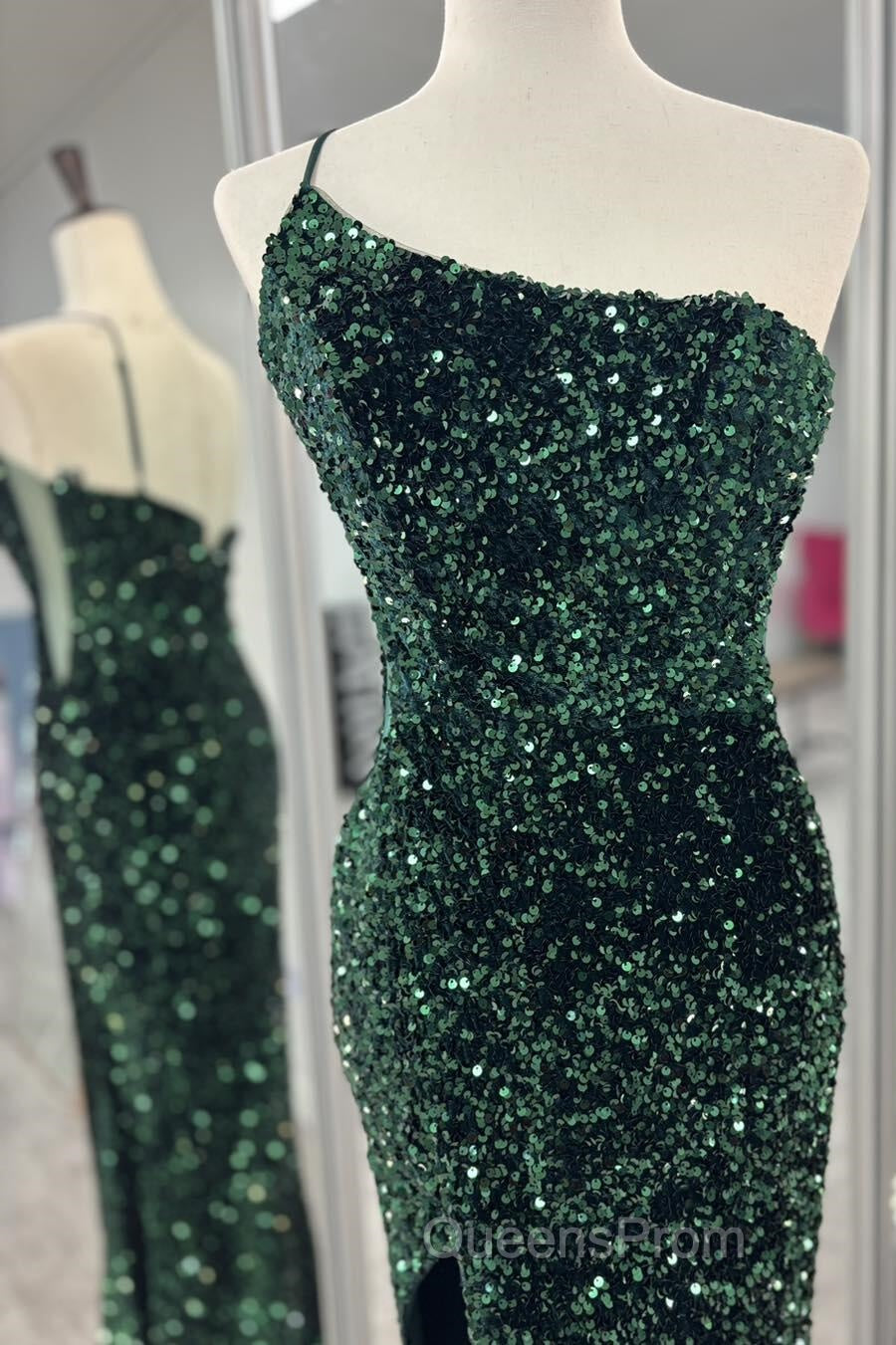 One Shoulder Long Emerald Green Evening Prom Dress Mermaid Sequin
