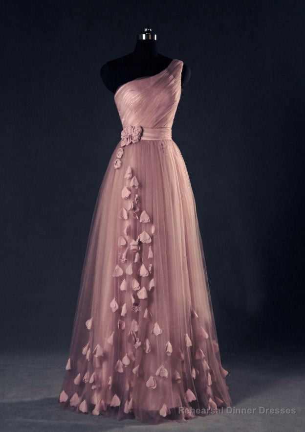 One-Shoulder Long/Floor-Length A-Line/Princess Tulle Prom Dresses With Flowers Waistband