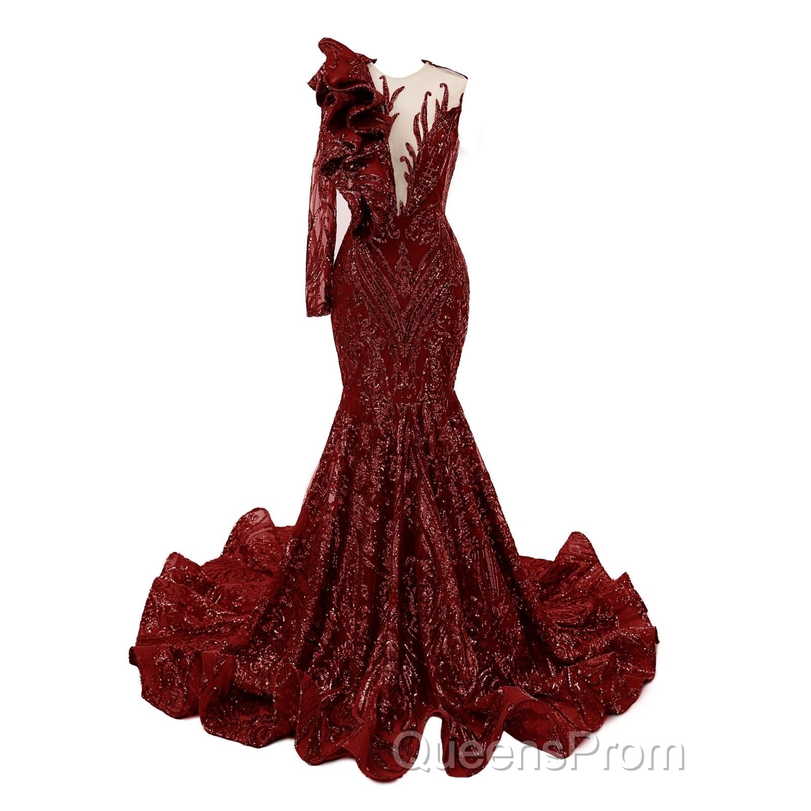 Orange Mermaid One Sleeve Evening Prom Dress Sequined Lace Jewel Ruffles Evening Party Dress with Appliques