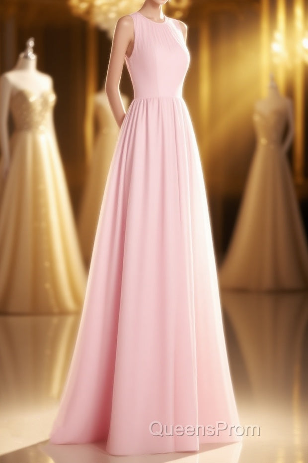 Pink Chiffon Halter Cutout Back A-Line Long Bridesmaid Dress
