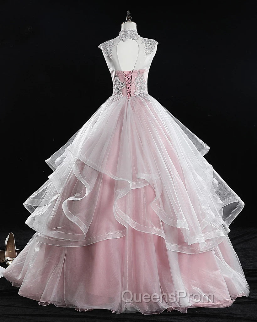 Pink High Neck Tulle Lace Long Evening Prom Dress, Pink Sweet 16 Gown