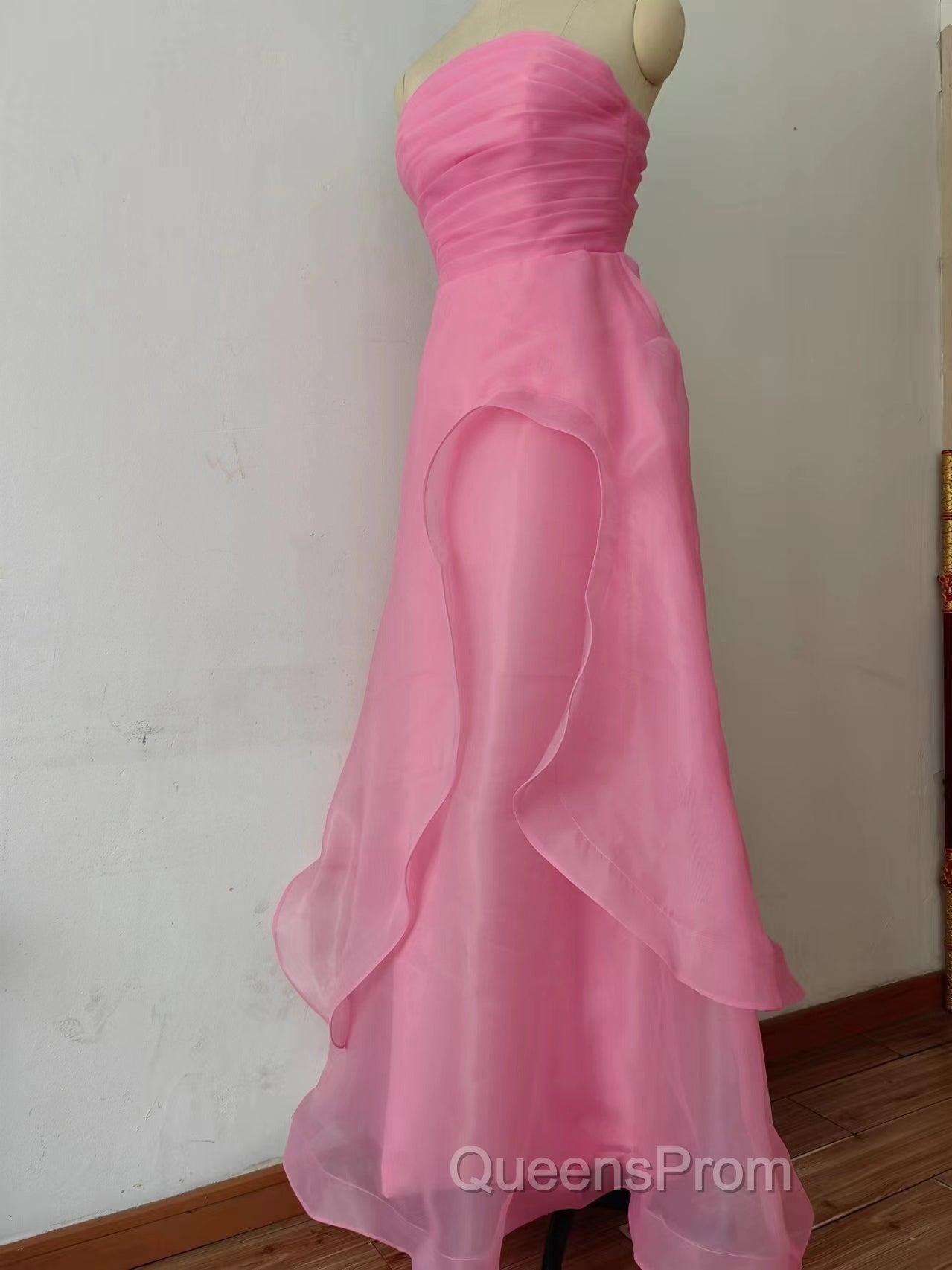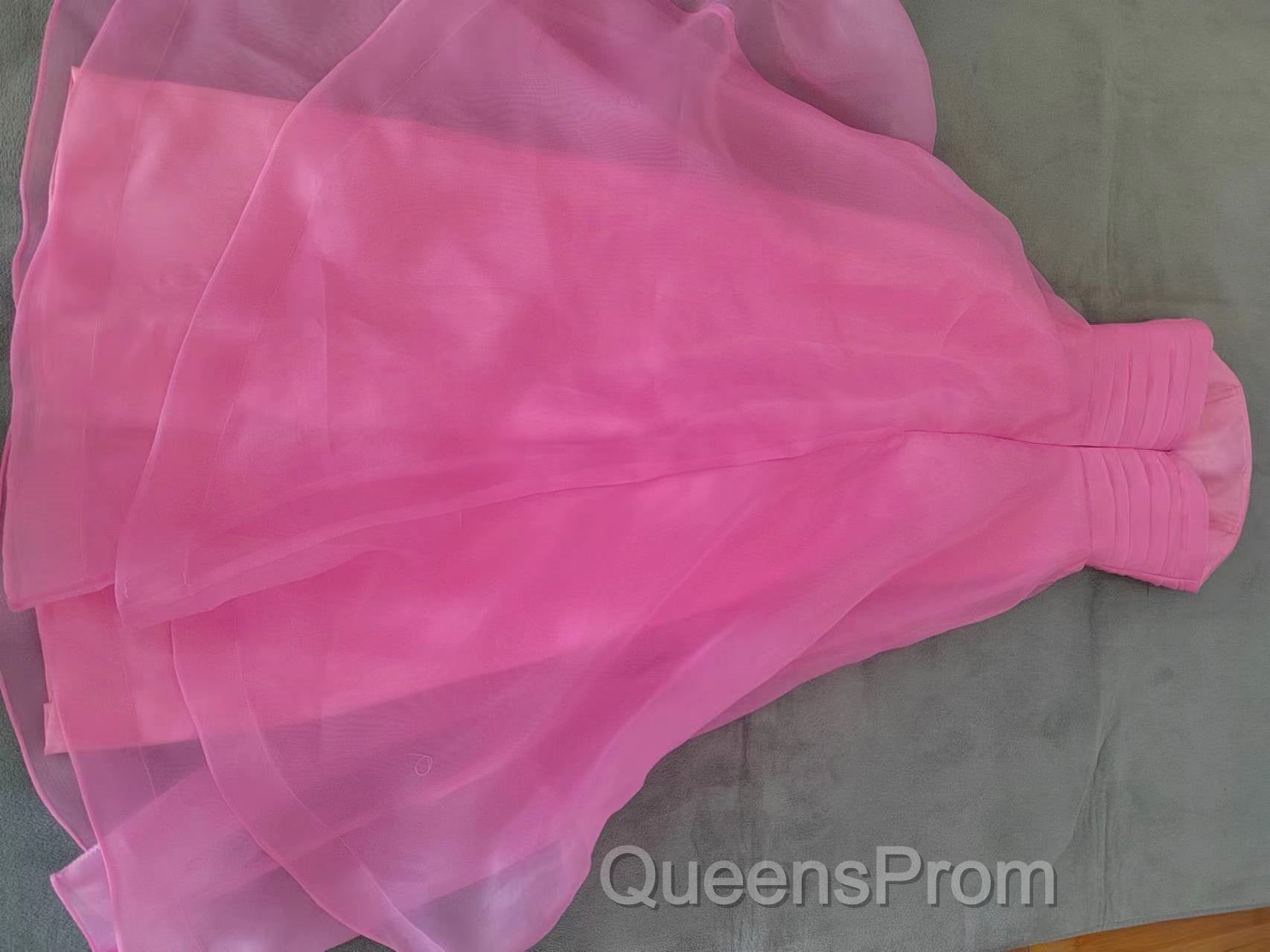 Pink Evening Prom Dress Tulle Evening Gown Strapless Ruffles A-line Simple Evening Prom Dress For Teens