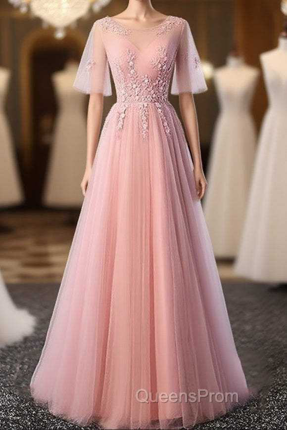 Pink Tulle A-Line Long Party Dress Bridesmaid Dress A Line Short Sleeves Floor Length Evening Prom Dress