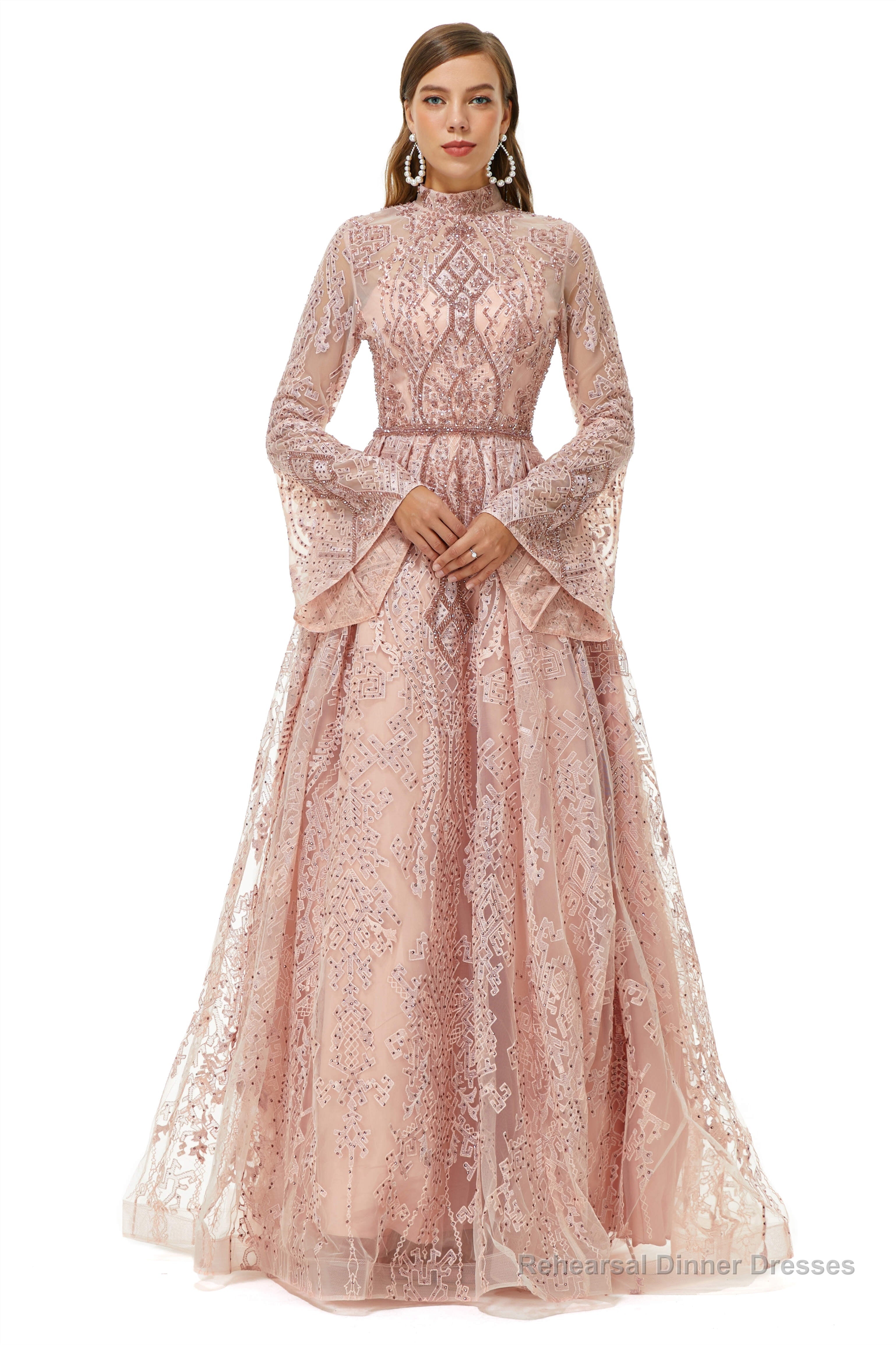Pink Tulle Appliques High Neck Long Sleeve Beading Prom Dresses