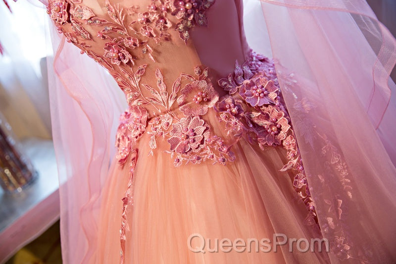 Pink Tulle Sweet 16 Party Dress With Lace Applique, Long Formal Gown
