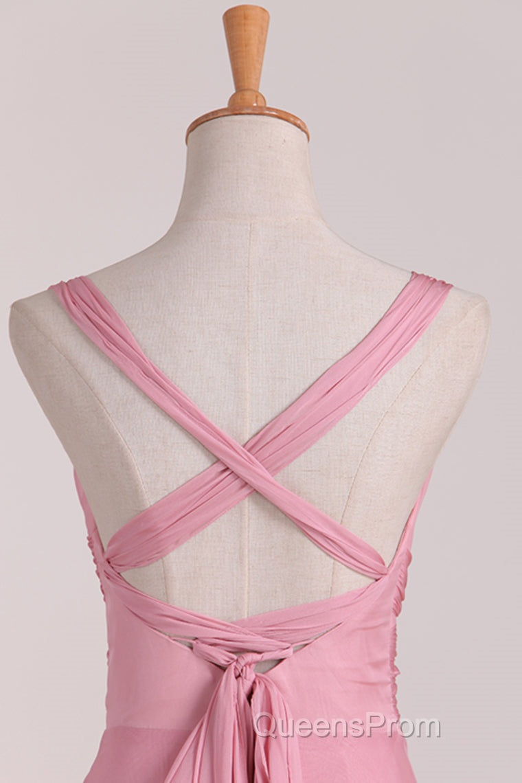 Pink V-Neck Lace-Up Long Bridesmaid Dress