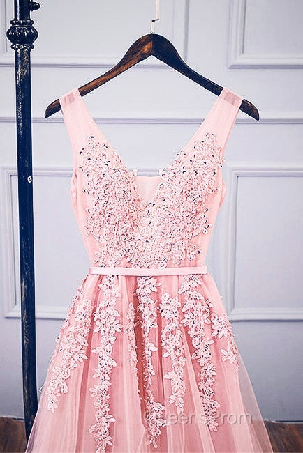 Pink V Neck Tulle Lace Applique Long Evening Prom Dress, Pink Bridesmaid Dress