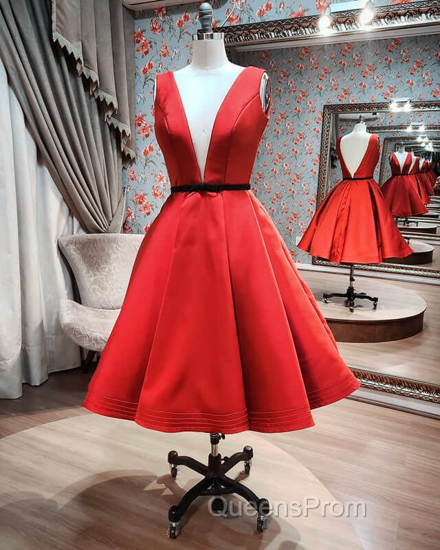 Plunging Neck Black Sashes Satin Knee Length Dress