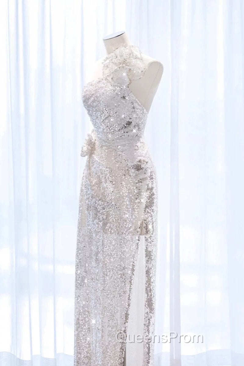 Pretty A Line One Shoulder Silver Sequin Long Length Evening Dress Evening Prom Dress