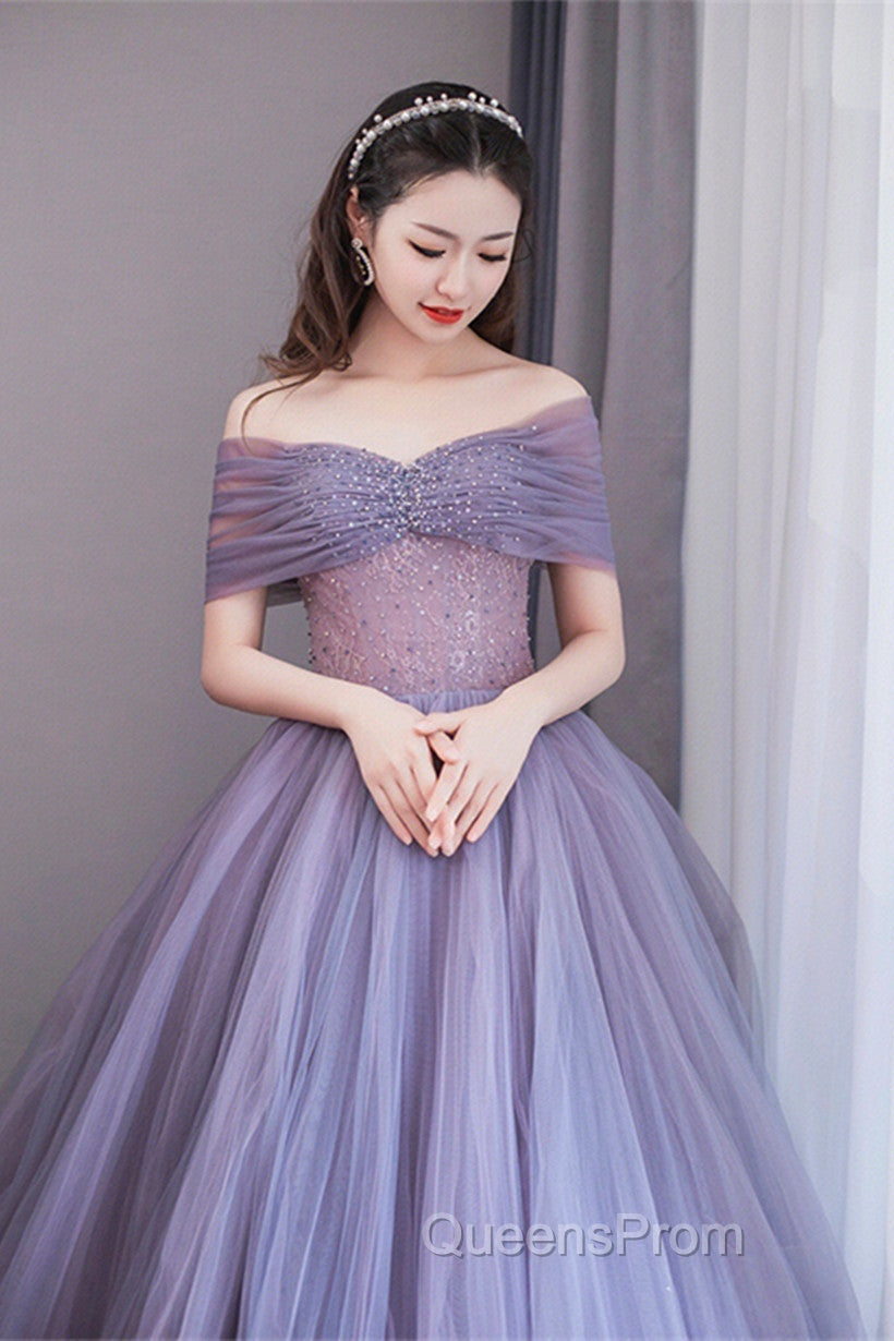Purple Beaded Tulle Ball Gown Formal Dress, Off Shoulder Sweet 16 Formal Dress