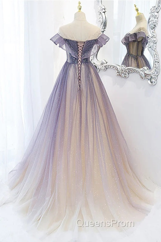 Purple Gradient A-Line Beaded Tulle Long Evening Prom Dress, Floor Length Purple Evening Dress