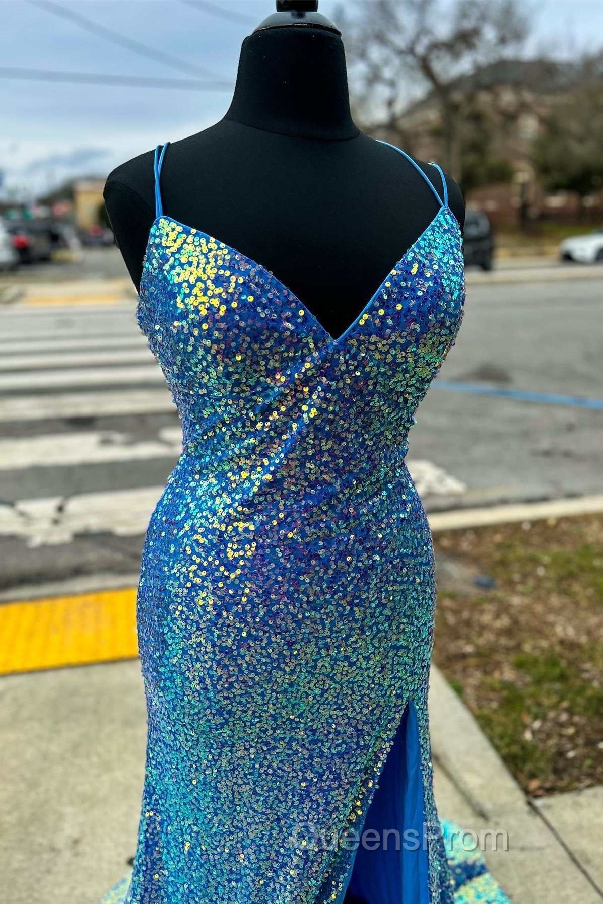 Purple Iridescent Sequin Empire Waist Lace-Up Mermaid Long Dress with Slit
