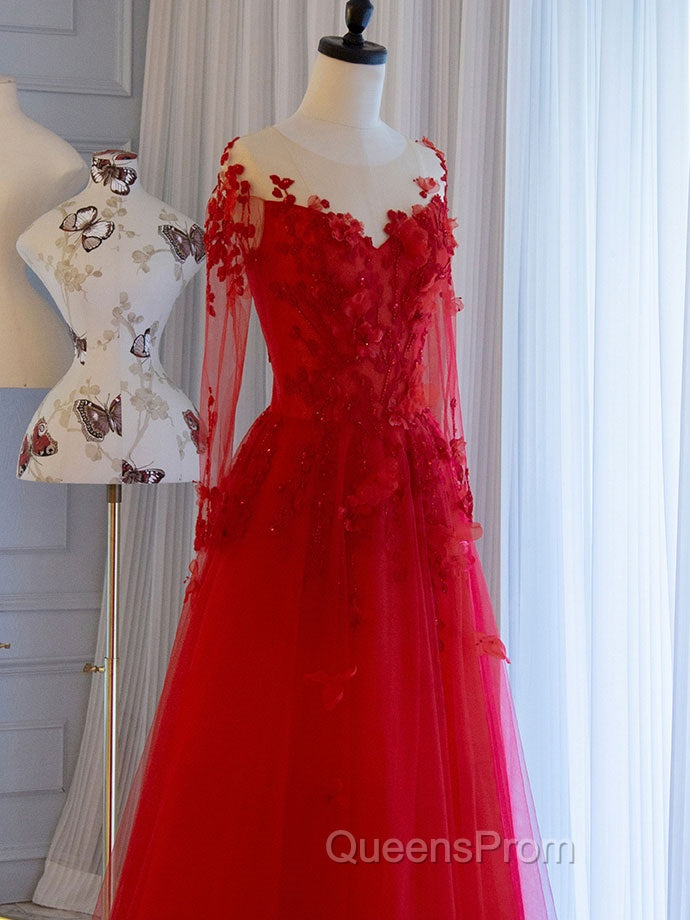 Red round neck tulle lace long Evening Prom Dress, red evening Dress