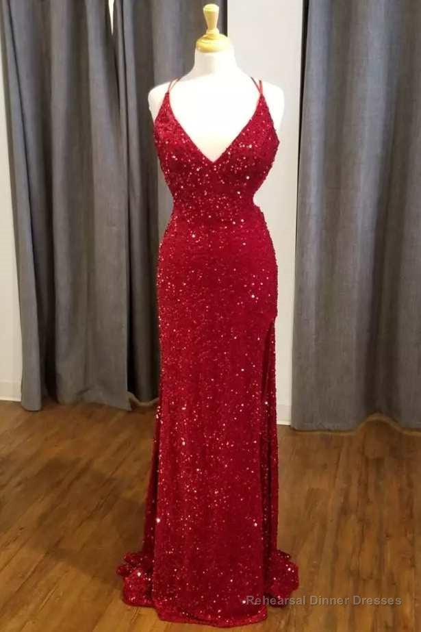 Red Sequin V-Neck Mermaid Long Formal Dress