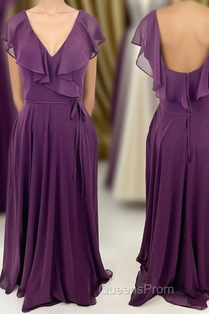 Ruffles Purple Chiffon A-line Long Bridesmaid Dress
