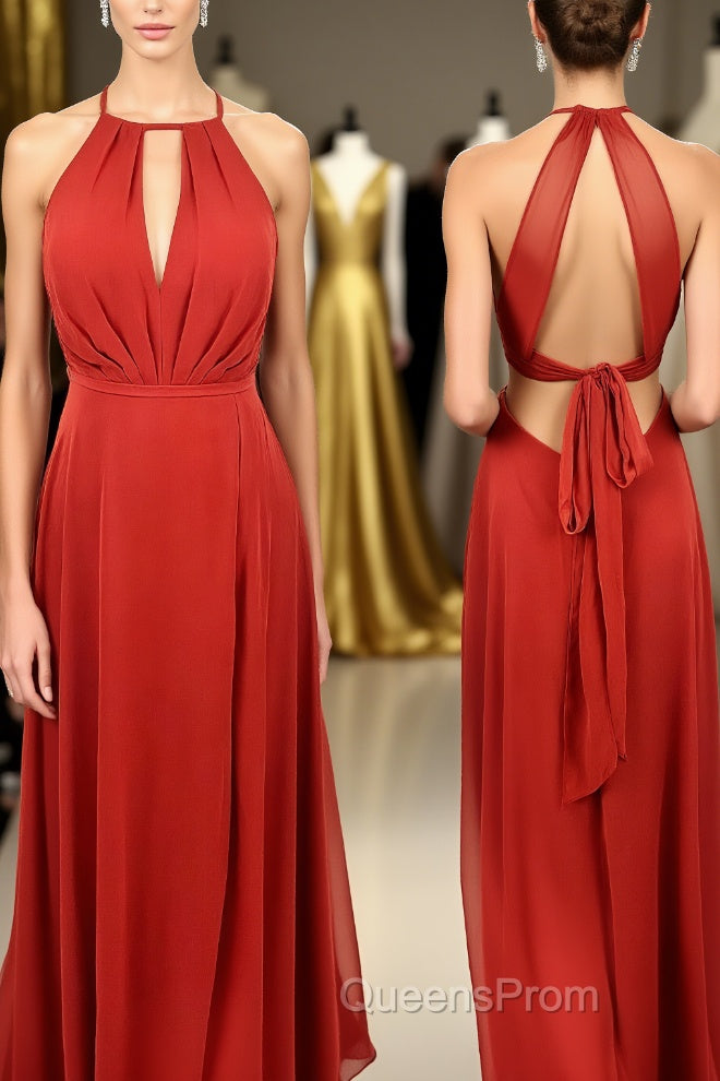 Scoop Red A-line Chiffon Long Bridesmaid Dress with Open Back