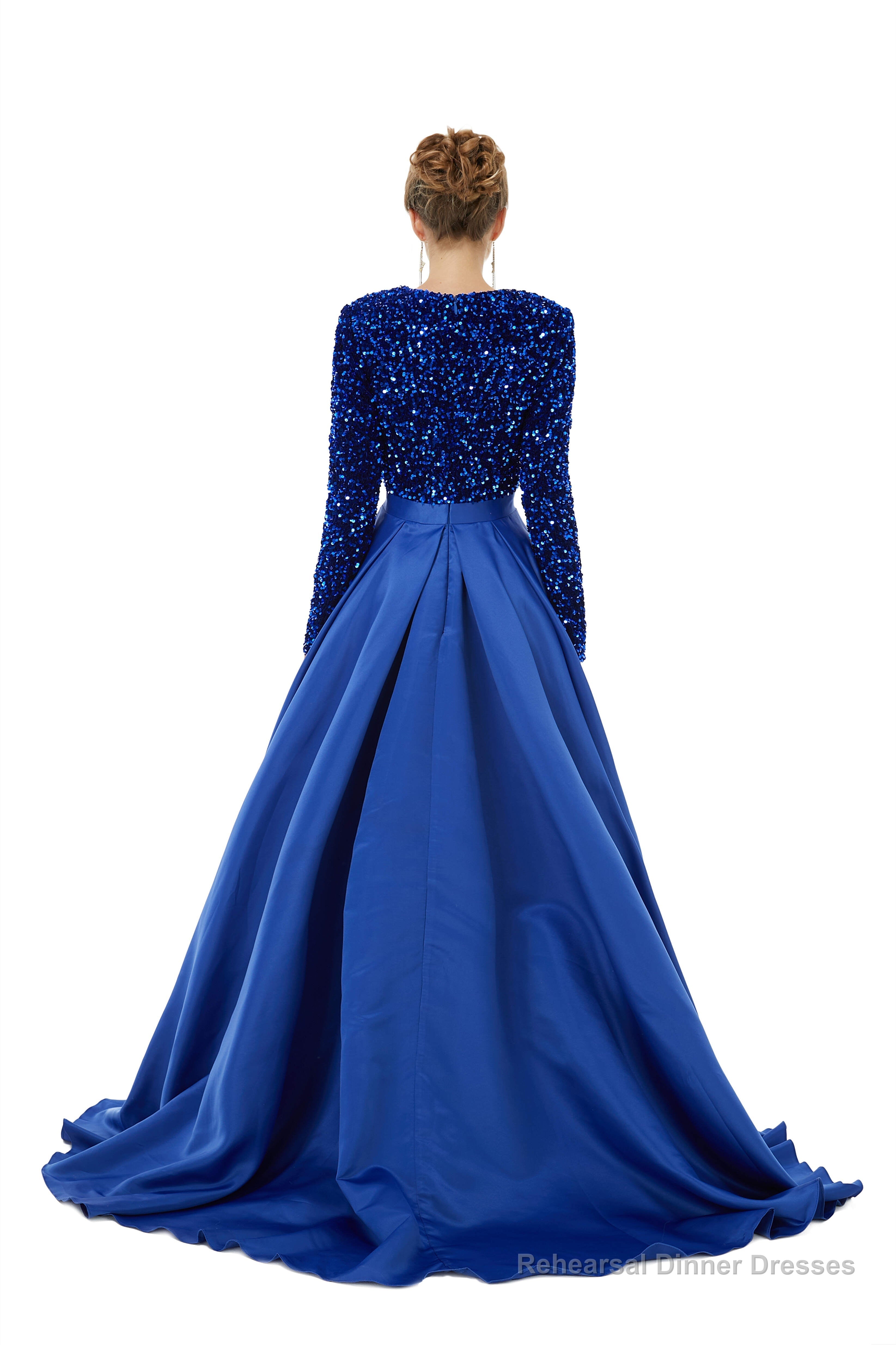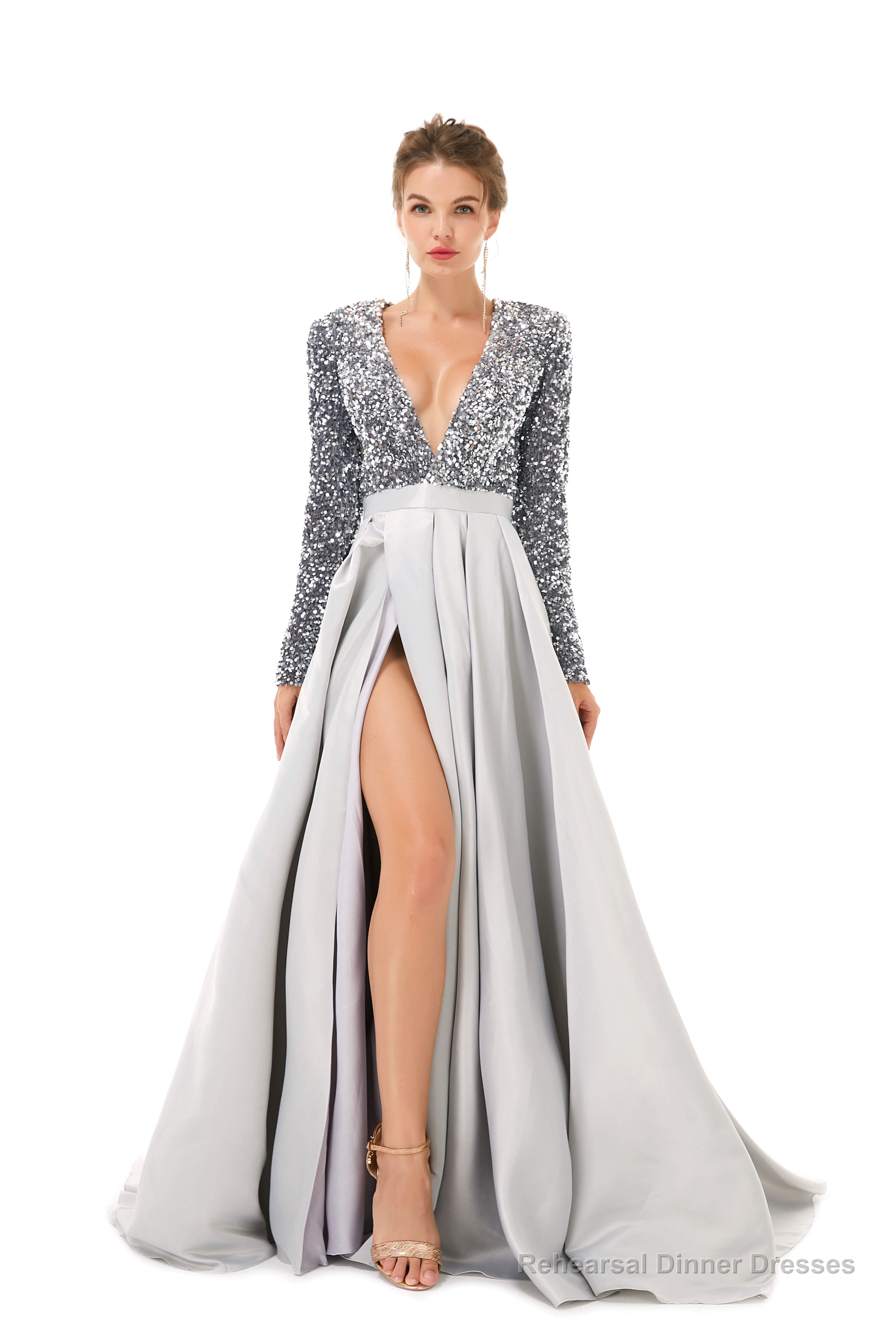 Sequined Satin A Line Front Slit V Neck Full Sleeve Sweep Train Long Prom Dresses