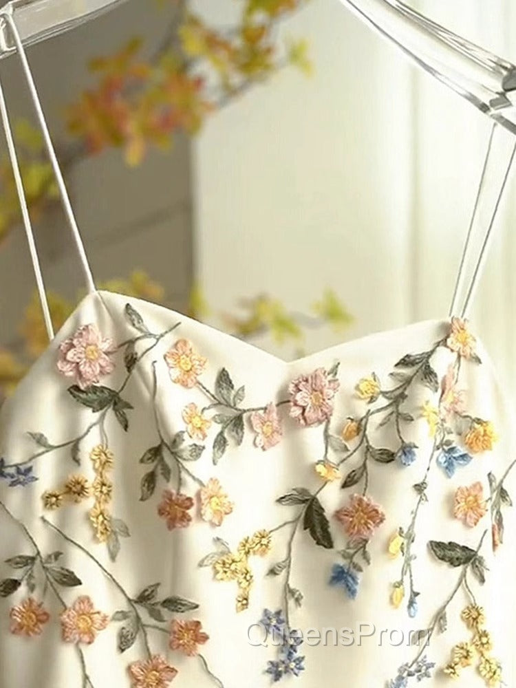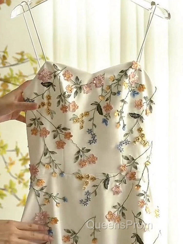 Sexy A Line Spaghetti Straps Ivory Floral Satin Evening Prom Dress Birthday Outfits Evening Gown