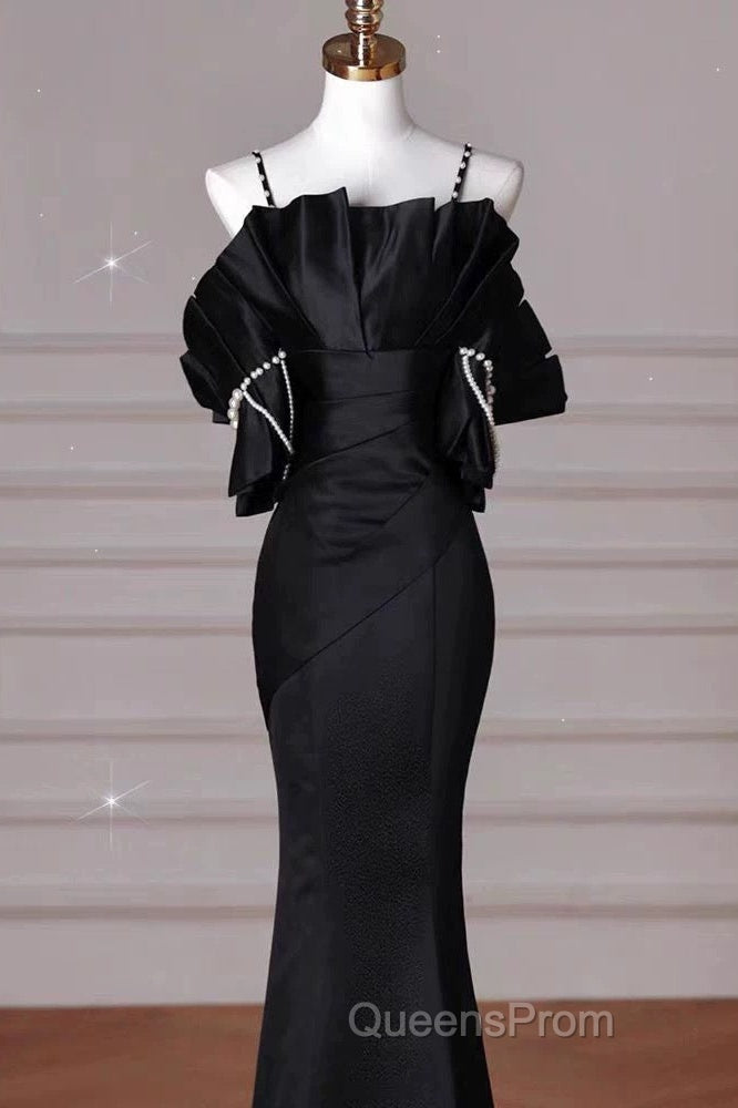 Sexy Mermaid Spaghetti Straps Black Long Formal Dress Satin Evening Prom Dress