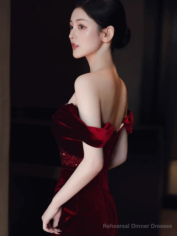 Sexy Sheath Off The Shoulder Burgundy Velvet Floor Length Evening Dress Prom Dresses