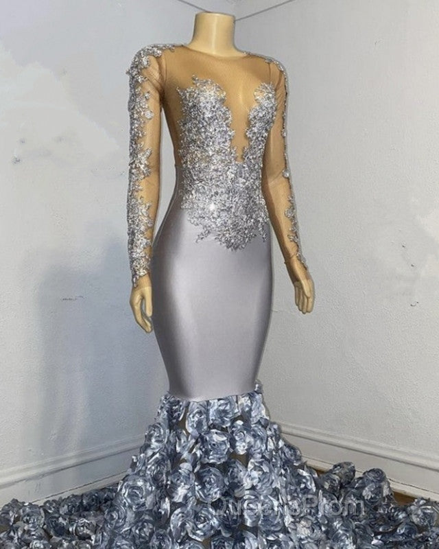 Silver Rosette Long Sleeve Mermaid Evening Prom Dress