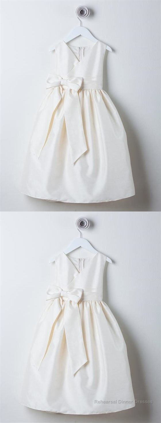 Simple Ivory V Neck Sleeveless A Line Satin Flower Girl Dresses With Bowknot