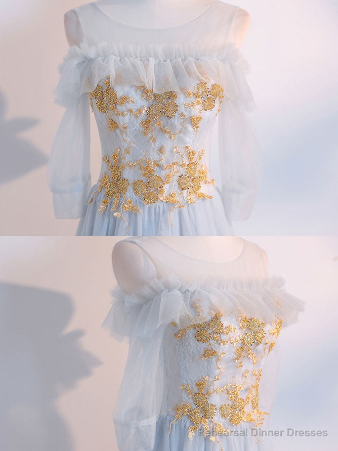 Simple Tulle Lace Gray Blue Prom Dresses, Tea Length Lace Bridesmaid Dresses