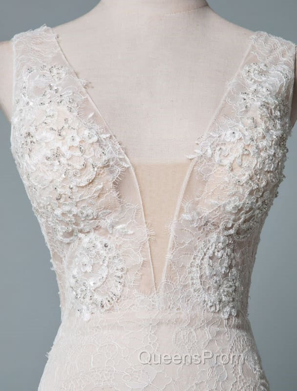Simple Wedding Dress Lace A Line V Neck Sleeveless Beaded Floor Length Feather Bridal Gowns