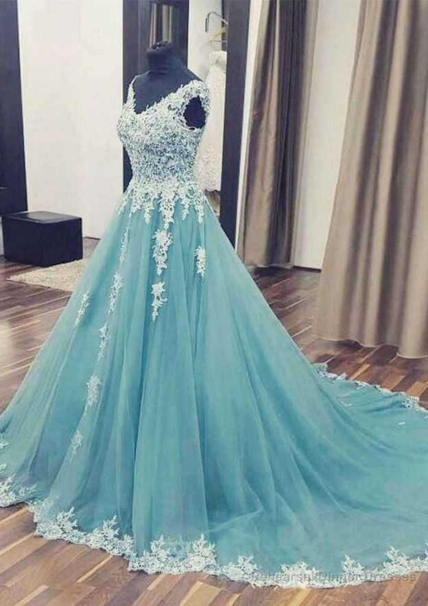 Sleeveless V Neck Chapel Train A-line/Princess Tulle Prom Dress With Hem Appliqued Lace