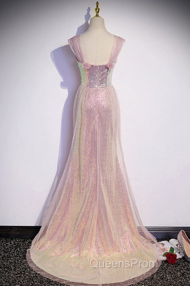 Sparkling Powder Blusher Pink Sequins Off Shoulder Short Sleeve Evening Dress Powder Blusher Pink Trumpet/Mermaid Open Back Zipper Sweep Tail Evening Prom Dress